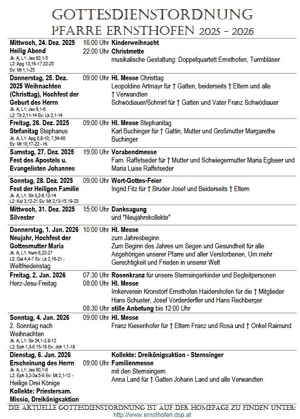 Gottesdienstordnung 24. Dez. 2025 - 6. Jänner 2026