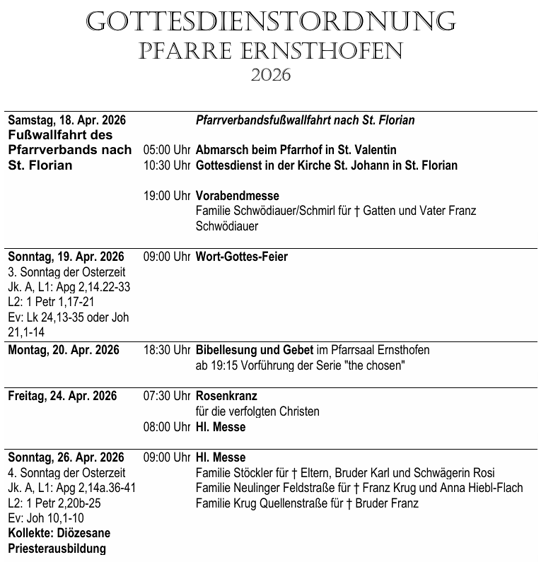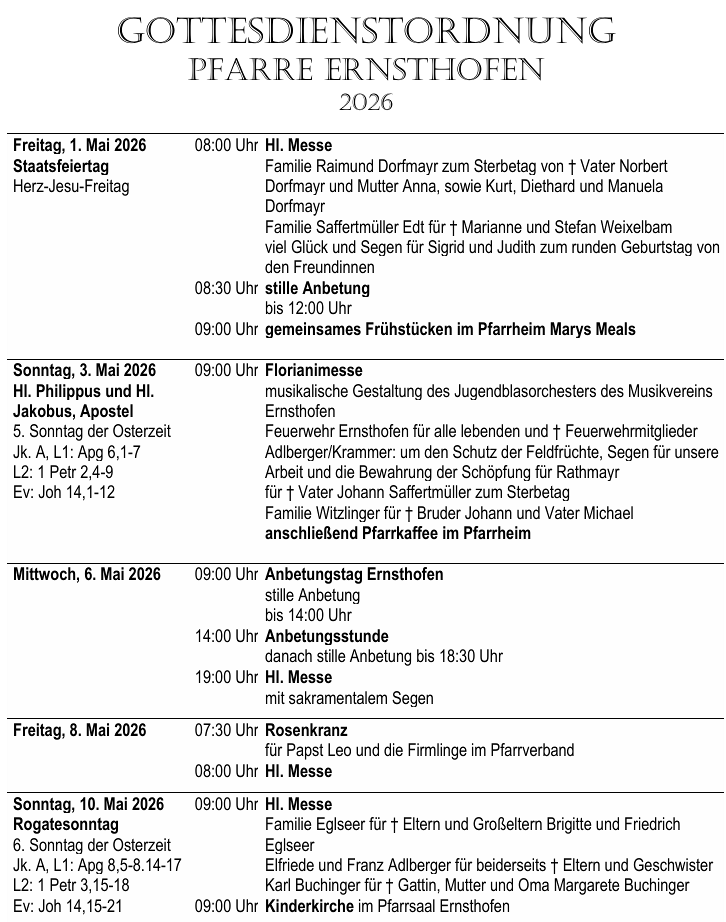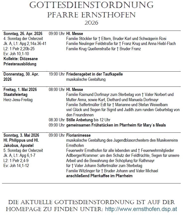 Gottesdienstordnung 26. April - 3. Mai 2026