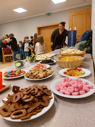 Unsere Allerheiligen-Party am 31. Oktober ist inzwischen zu einer lieb gewonnenen Tradition geworden. Im Pfarrheim Ernsthofen begaben sich Kinder und Erwachsene gemeinsam auf die Spuren der Heiligen – dieses Mal stand der Hl. Franziskus im Mittelpunkt. Gemeinsam tauchten wir in eine seiner Geschichten ein, sangen Lieder, beteten und gestalteten farbenfrohe Grablichter. Nach einer stärkenden Pause mit bunten Broten, Naschereien, Obst und Fruchtcocktails zogen wir mit Laternen durch die Nacht. Unterwegs verschenkten wir Lebkuchen und Freude, denn die Botschaft von Franziskus erinnert uns: Jeder von uns kann ein kleines Licht der Hoffnung sein.